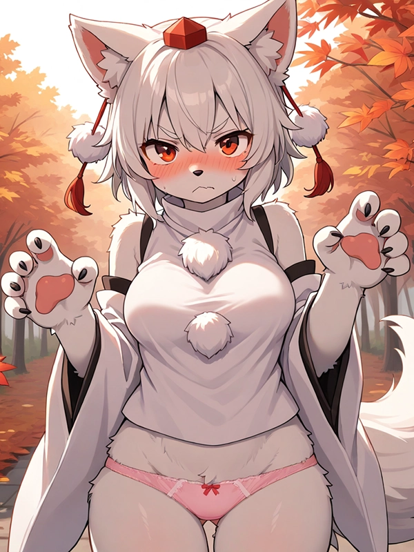 今度こそ上も脱がされてしまった椛ちゃんです。相変わらず隠しちゃ駄目なのでがおーポーズですが、表情で怒りとか恥ずかしさが一段階上がった感が出てていい感じじゃないでしょうか。